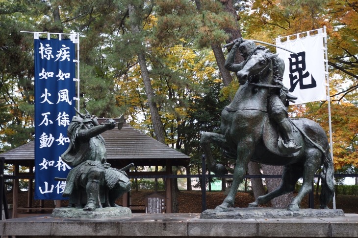 まず最初に紹介するのは川中島古戦場史跡公園です。長野市の川中島で12年間にわたって合計5回も行われた甲斐国の武田信玄と越後国の上杉謙信の合戦があった場所です。両軍8000人余りの死者数が出たと言われていることからも壮絶だったことが伺えます。